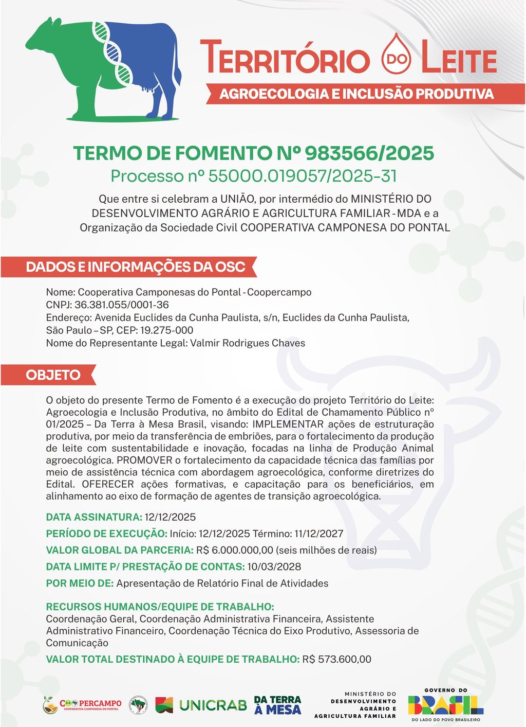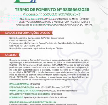 Descrição dTERMO DE FOMENTO Nº 983566/2025 Processo nº 55000.019057/2025-31 Que entre si celebram a UNIÃO, por intermédio do MINISTÉRIO DO DESENVOLVIMENTO AGRÁRIO E AGRICULTURA FAMILIAR - MDA e a Organização da Sociedade Civil COOPERATIVA CAMPONESA DO PONTALo post.